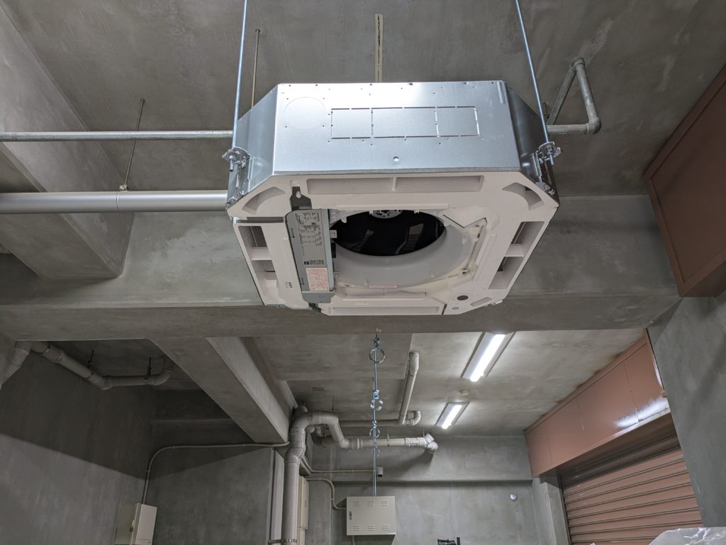 長崎県佐世保市での、業務用エアコン4方向天井カセット型の設置工事です。